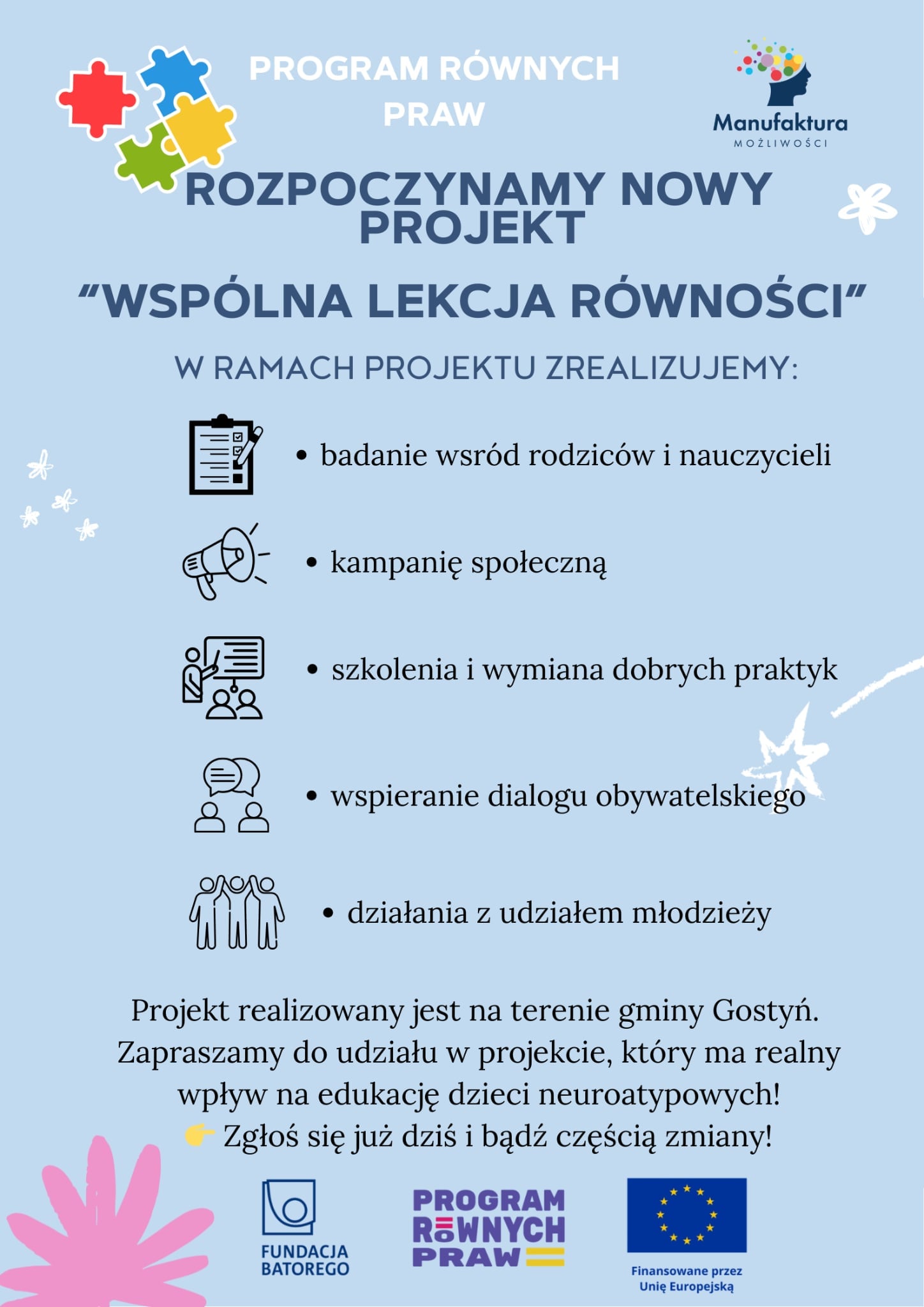Rok 2025 Wspólna Lekcja RównościCzytaj dalejRok 2025 Młodsze pokolenie obywateliCzytaj dalejRok 2024 Wzmocnienie odporności Fundacji Manufaktura Możliwości szansą na rozwój usług społecznychCzytaj dalejRok 2024 Warto być przedsiębiorstwem SpołecznymCzytaj dalejrok 2023/24 Podsłuchaj mojego dziadkaCzytaj dalejrok 2023/24 LOWESCzytaj dalejRok 2022/23 Kierunek samodzielnośćCzytaj dalejRok 2021 Wymiana zużytego laptopa na nowy niezbędny do działań Fundacji Manufaktura MożliwościCzytaj dalejRok 2021 Wszyscy jesteśmy EinsteinamiCzytaj dalej